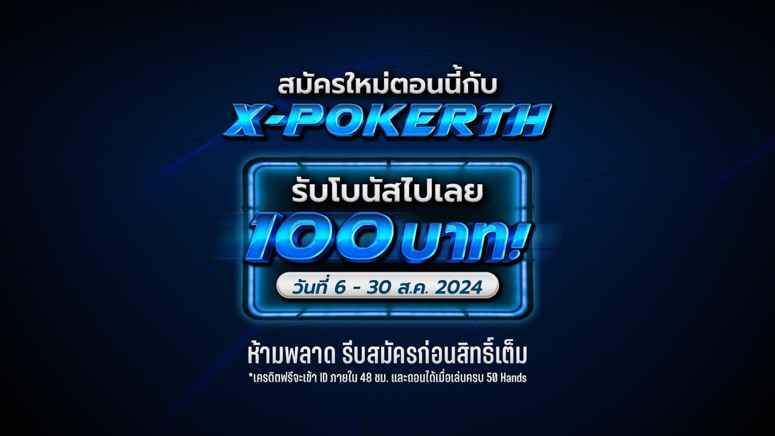 สมัครใหม่กับ X-POKERTH ตอนนี้รับโบนัสฟรีทันทีไปเลย 100 บาท!
