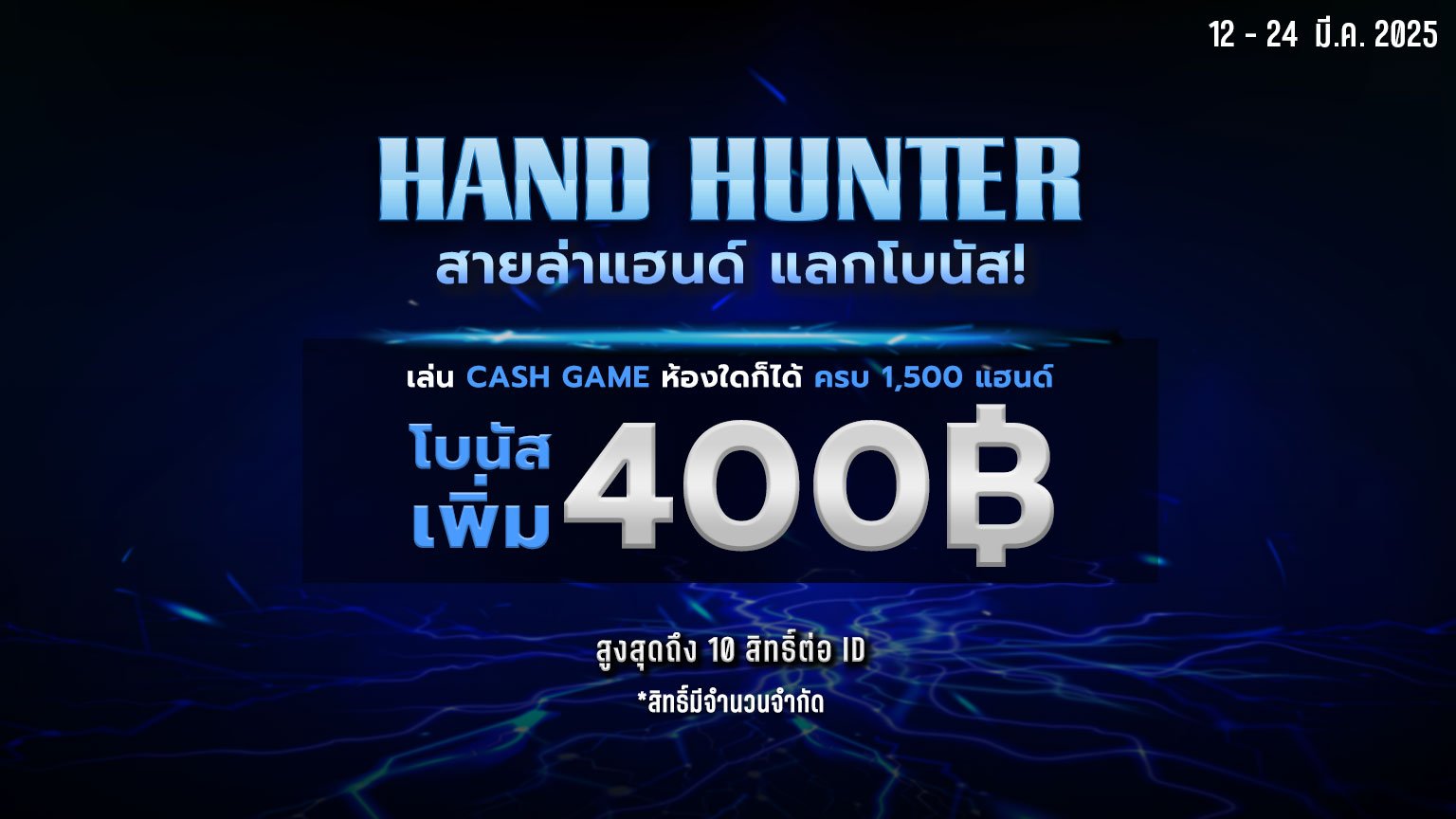 เล่น CASH GAME ครบ 1,500 HANDS รับโบนัสเพิ่ม 400 บาท