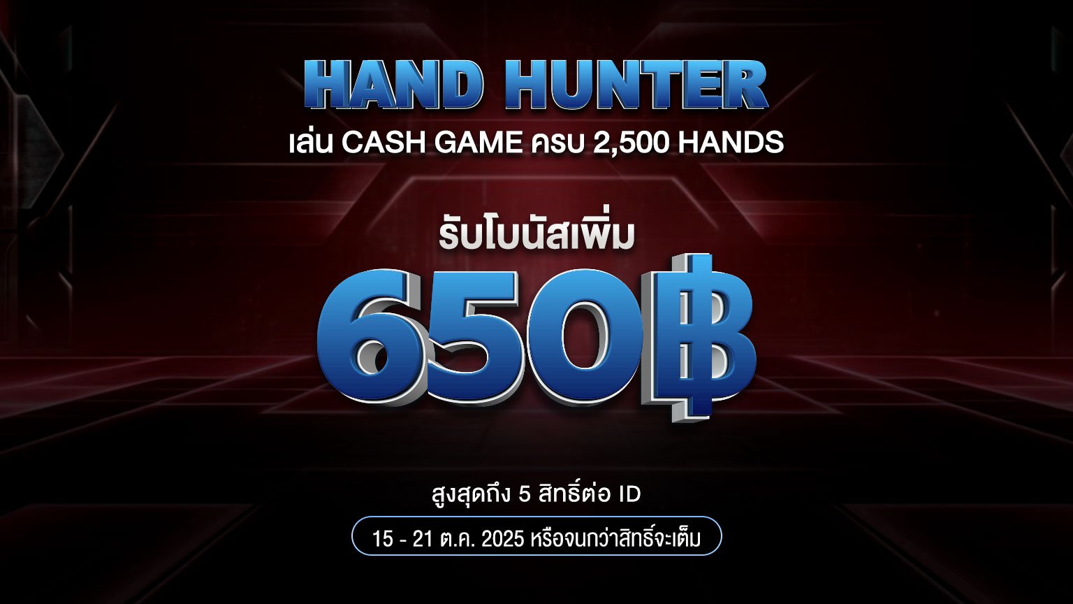 เมื่อเล่น Cash game ครบ 2,500 HANDS แลกโบนัสคืน 650 บาท