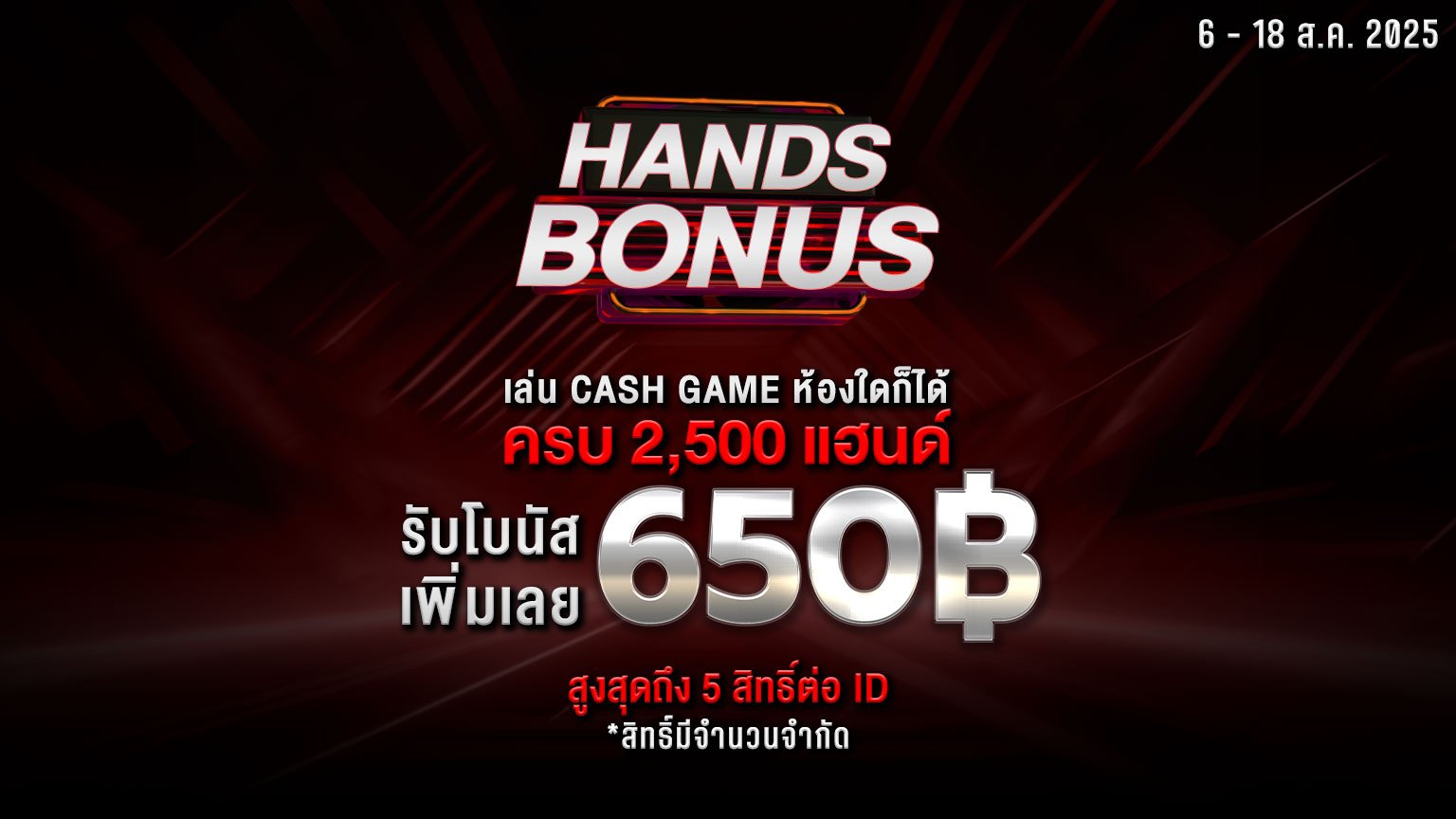 เมื่อเล่น Cash game ครบ 2,500 HANDS แลกโบนัสคืน 650 บาท