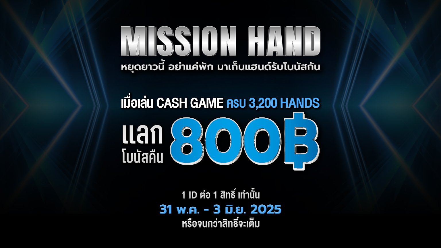 MISSION HAND / Promotion / By mkt.technical MISSION HAND ⚔️หยุดยาวนี้ อย่าแค่พัก มาเก็บแฮนด์รับโบนัสกันเมื่อเล่น Cash game ครบ 3,200 HANDS แลกโบนัสคืน 800 บาท1 ID ต่อ 1 สิทธิ์ เท่านั้นCapture หลักฐานส่งที่ LINE31 พ.ค. – 3 มิ.ย. 2025 หรือจนกว่าสิทธิ์จะเต็มเงินรางวัลจะเข้า ID ภายในวันที่ 6 มิ.ย. 2025——XPOKERTH คลับโป๊กเกอร์ยอดนิยมของเอเชีย แอดเลย @XPOKER.TH